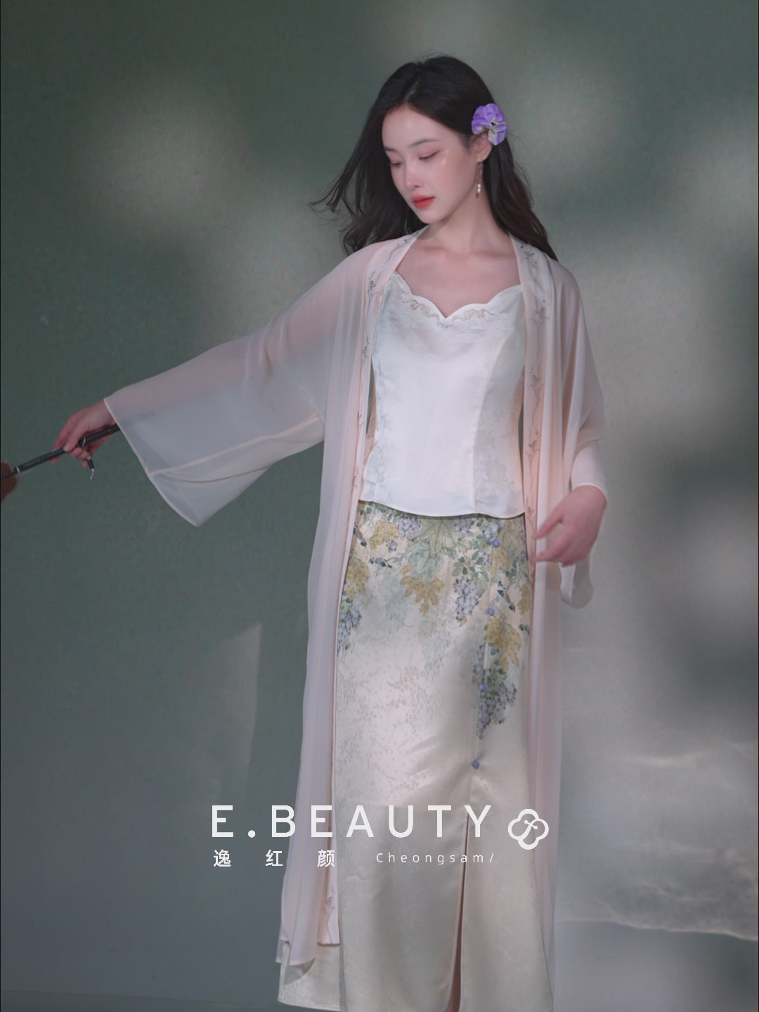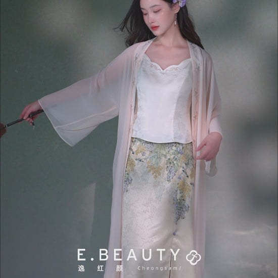 Pale Pink Silk Embroidered | Hanfu-Style Long Draped Cardigan (菲芸)